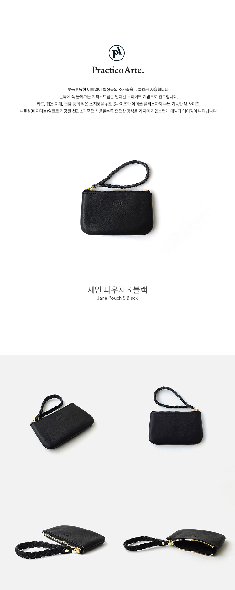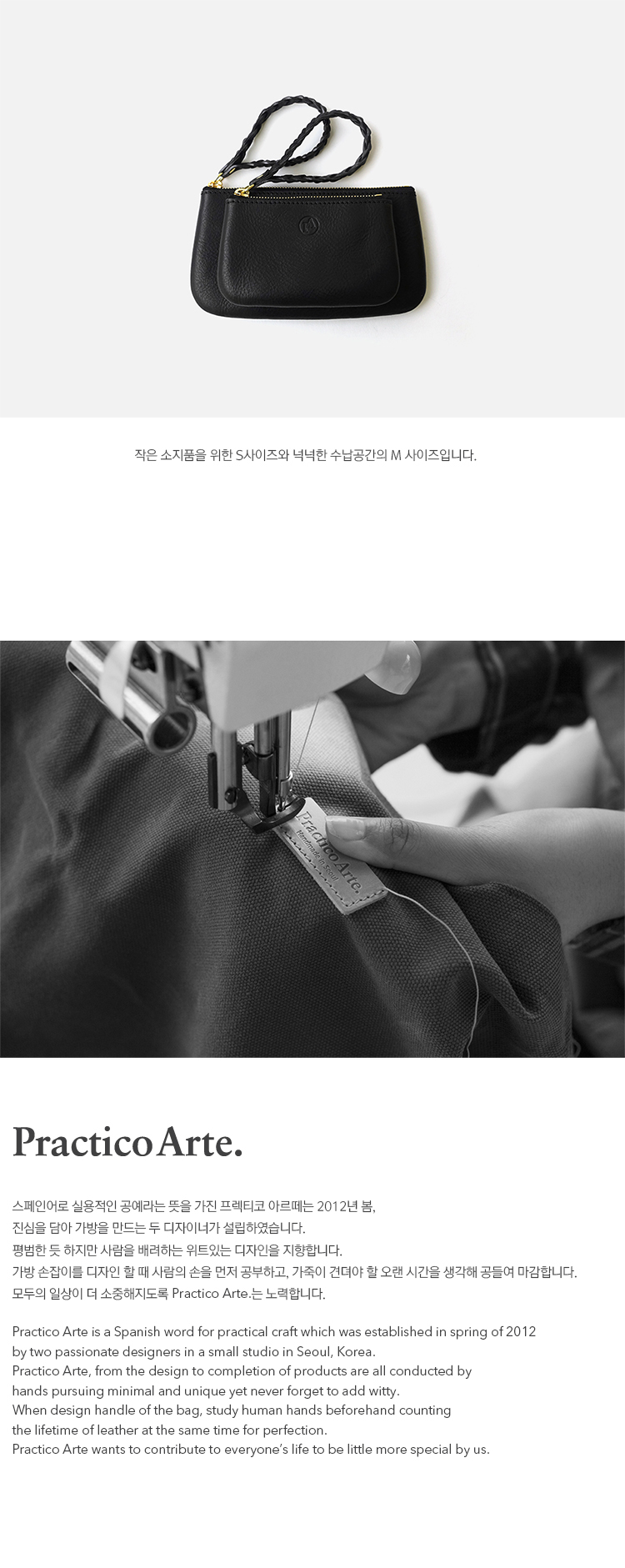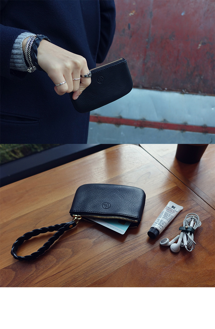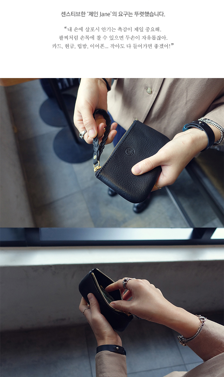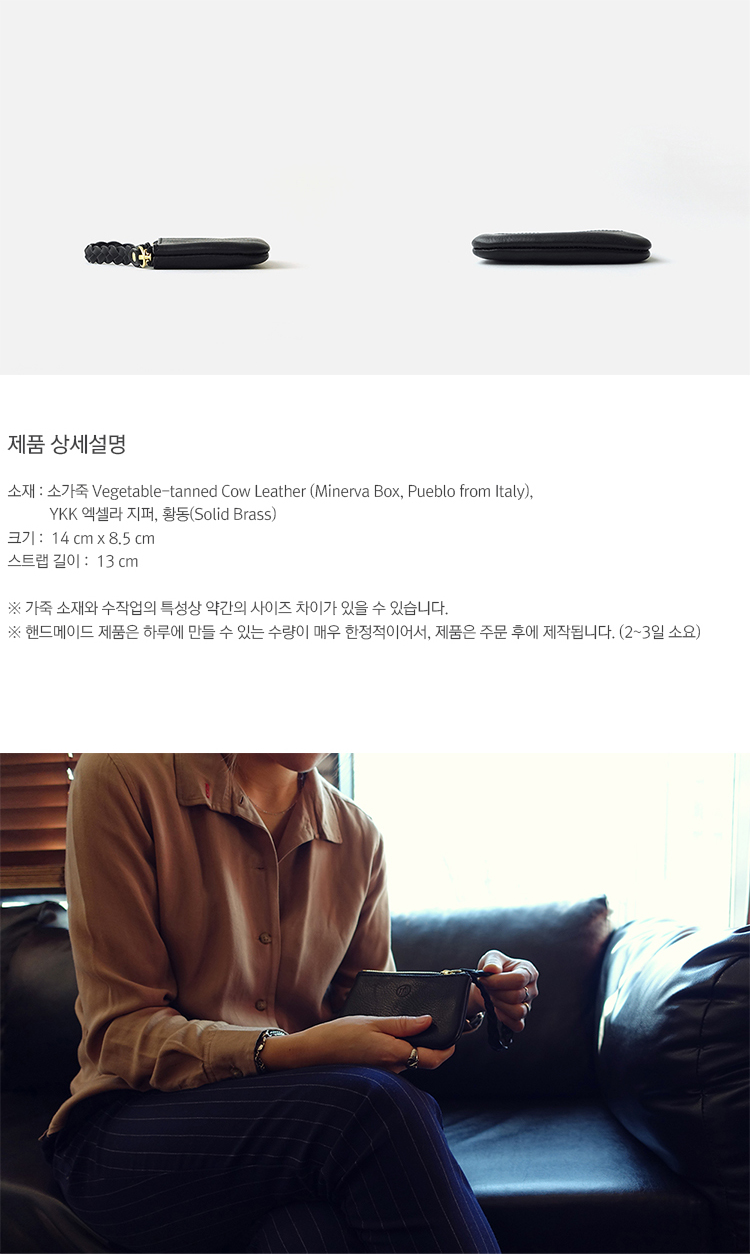 - 주문시 유의사항 : 가죽 소재와 수작업의 특성상 약간의 사이즈 차이가 있을 수 있습니다. 핸드메이드 제품은 하루에 만들 수 있는 수량이 매우 한정적이어서, 제품은 주문 후에 제작됩니다. (2~3일 소요) 부들부들한 이탈리아 최상급의 소가죽을 두툼하게 사용합니다. 손목에 쏙 들어가는 지퍼스트랩은 인디언 브레이드 기법으로 견고합니다. 카드, 접은 지폐, 립밤 등의 작은 소지품을 위한 S사이즈와 아이폰 플러스까지 수납 가능한 M 사이즈. 식물성(베지터블)염료로 가공된 천연소가죽은 사용할수록 은은한 광택을 가지며 자연스럽게 태닝과 에이징이 나타납니다.