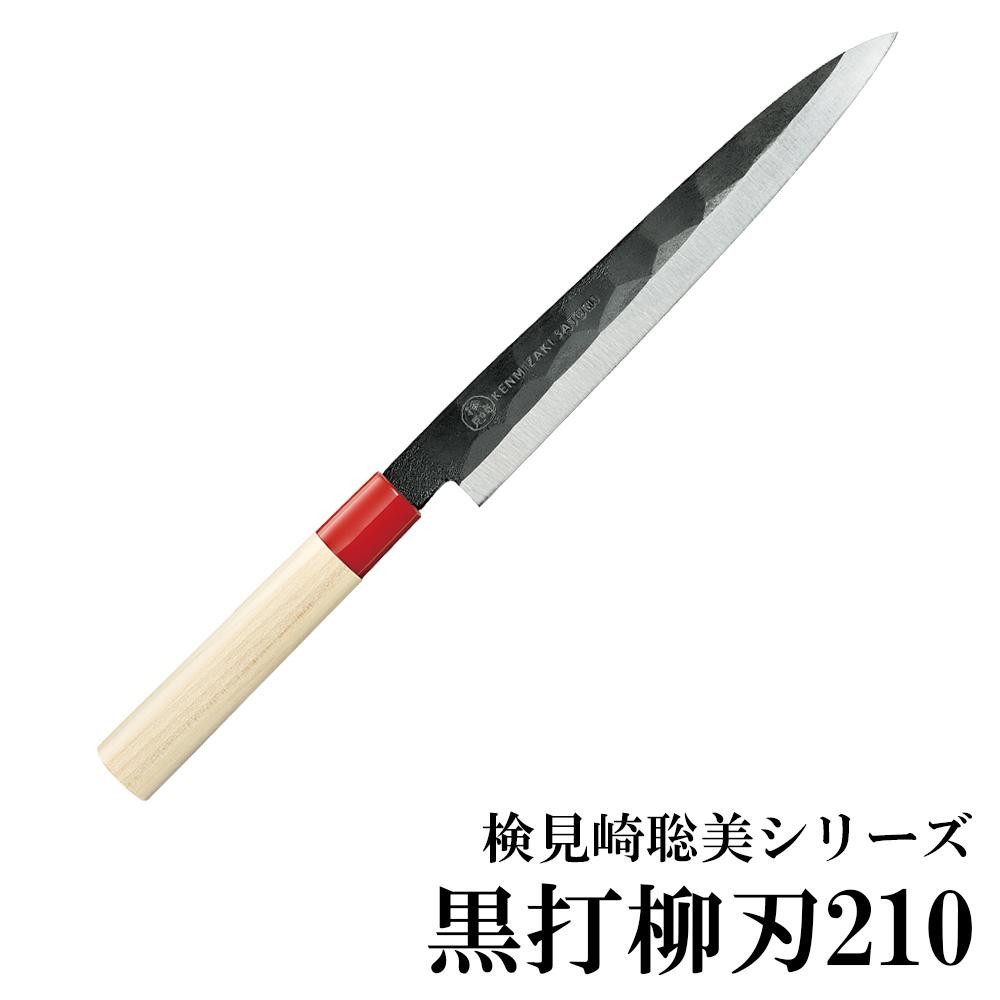 柄に天然木を使用した、黒い刀身が特長的な柳刃包丁です。 製造国:日本 素材・材質:刀身:軟鉄プラス日立ヤスキ鋼鍛造、柄:天然木 商品サイズ:刃渡り:210mm、全長:353mm 仕様:食洗機使用不可 ※サプライヤー直送品 ご注文後5~6営業日後の出荷となります【商品名】検見崎聡美シリーズ 黒打柳刃210 KZ-108