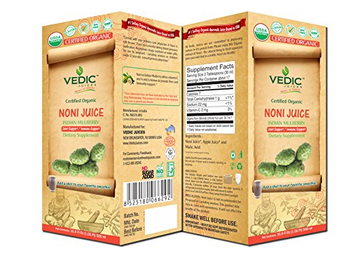 -. Binding : Health and Beauty -. Brand : Vedic Juices -. EAN : 8904045052975 -. Feature : VEDIC AYURVEDIC JUICES ARE THE ONLY TRULY USDA CERTIFIED ORGANIC JUICES. Furthermore our juices are made from fresh fruit and not from powder or flavors. / JOINT SUPPORT / IMMUNE SUPPORT Noni offers Vitamin C and A and is known to provide liver and immunity support * / NONI ALSO KNOWN AS MORINDA CITRIFOLIA, and commonly known as great morinda, Indian mulberry and host of other names is a fruit from a tree in the coffee family -Rubiaceae. -. IsAdultProduct : 0 -. Label : Vedic Juices -. Manufacturer : Vedic Juices -. MPN : T9-LGWF-9CU8 -. PackageQuantity : 1 -. PartNumber : T9-LGWF-9CU8 -. ProductGroup : Beauty -. ProductTypeName : HEALTH_PERSONAL_CARE -. Publisher : Vedic Juices -. Studio : Vedic Juices -. Title : Noni Juice 500 Milliliter USDA Certified Organic Juice by Vedic Juices