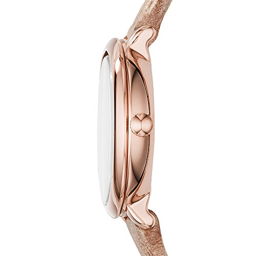 Stainless steel case. Leather strap with buckle closure. Three-hand analog display with quartz movement. Dial features rose gold-tone hands and hour markers. Water resistant 5 ATM/50 meters.