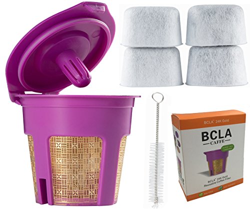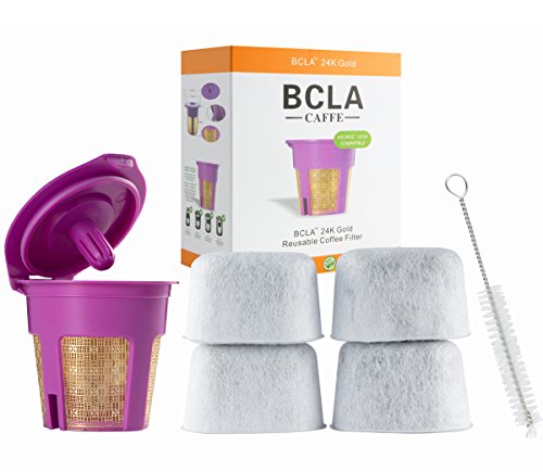 24K Gold K-Cup Reusable Filter for Keurig 2.0 / 1.0 My K Cup Single Serve Coffee Filters Kcup Refillable Permanent Replacement Cup by BCLA, Bonus 4 pack Charcoal Water Filters and 1pc Brush