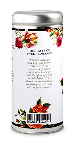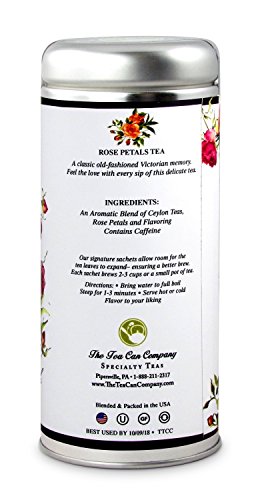 -. Binding : Misc. -. Brand : The Tea Can Company -. EAN : 0602003122200 -. Feature : 10 Premium Pyramid Tea Sachets / Brews 20-30 Cups (depending on strength) / Blended and Packed in the USA / A classic old-fashioned Victorian memory. Feel the love with every sip of this delicate tea. / Gourmet, quality taste of loose leaf tea with the ease and convenience of a tea bag. -. IsAdultProduct : 0 -. Label : The Tea Can Company -. Manufacturer : The Tea Can Company -. NumberOfItems : 1 -. PackageQuantity : 1 -. ProductGroup : Grocery -. ProductTypeName : GROCERY -. Publisher : The Tea Can Company -. Studio : The Tea Can Company -. Title : Rose Petals Tea -. UPC : 602003122200