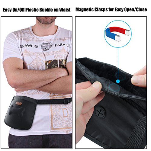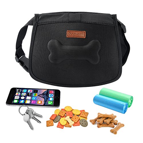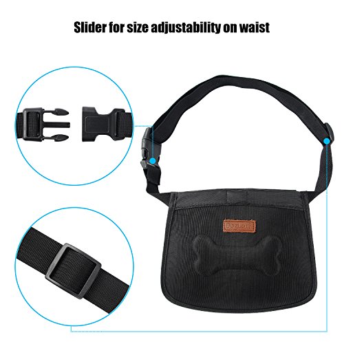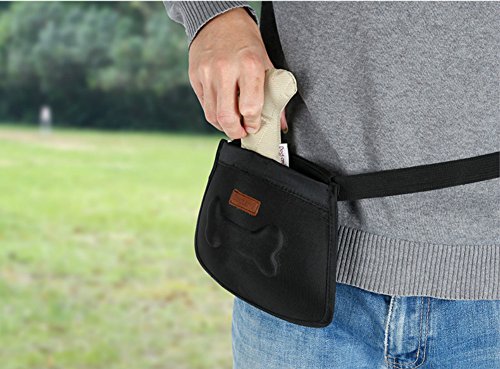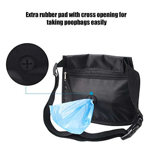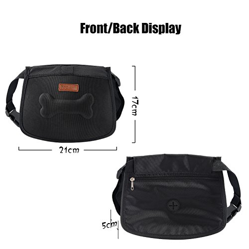 -. Feature : Holds Treats, Toys, Phone, Keys : This cleverly designed bag has a large compartment for treats and toys and zippered pockets for phone, keys, etc. The dimensions when closed are 8.27"x6.69"x2" / Adjustable strap: The strap is easily adjustable, 25"x39", and can be worn around the waist or over the shoulder. Be hands free when walking or training your dog. / Poop Bag Dispenser: The pouch comes with a convenient, built-in waste bag dispenser. Easy to get a bag when you need it without pulling out the entire roll. / Material: Molded EVA to give it shape covered by tough Oxford nylon fabric with waterproof interior. Treats will stay fresh and dry. Magnetic clasps for easy open/close. / Guarantee: This high quality pouch is great for walking or training your dog. 100% satisfaction is our guarantee.