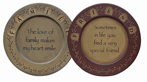 Studio : CWI Gifts Publisher : CWI Gifts Binding : Kitchen Product Description CWI Gifts 9.5" 2Pc Friends Family Plate Set. 9" press wood plates with lightly distressed paint finish featuring a berry vine border, primitive tags that spell out "FRIEND" or "FAMILY" and an inspirational quote stenciled in the center. Not food safe. 0
