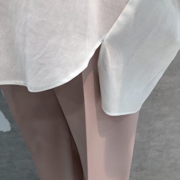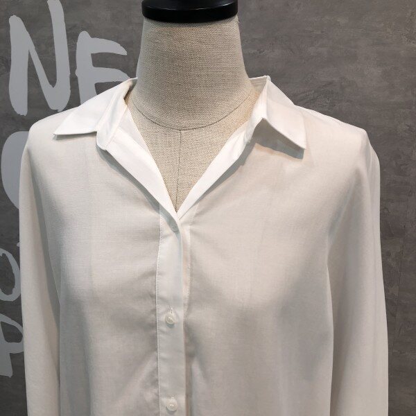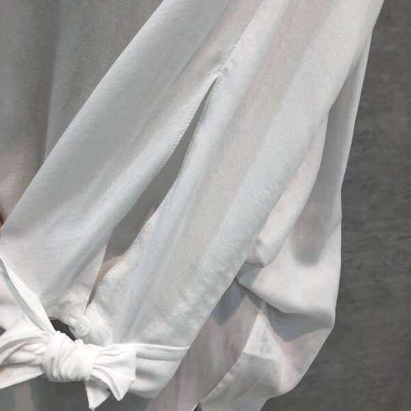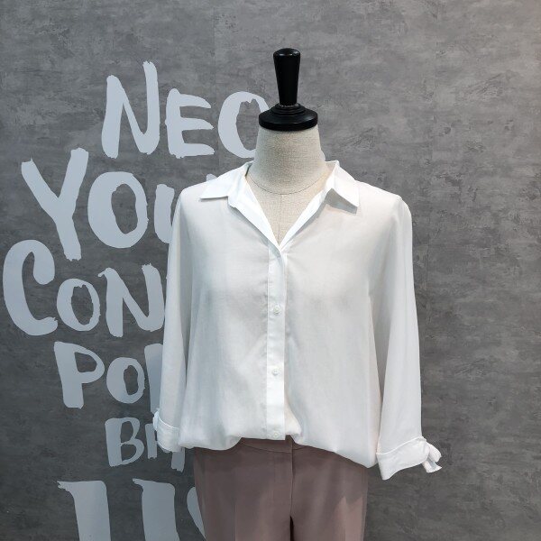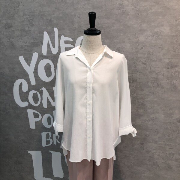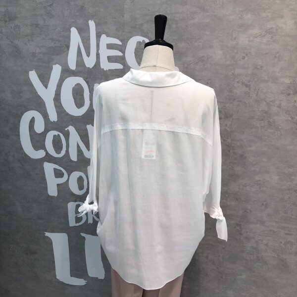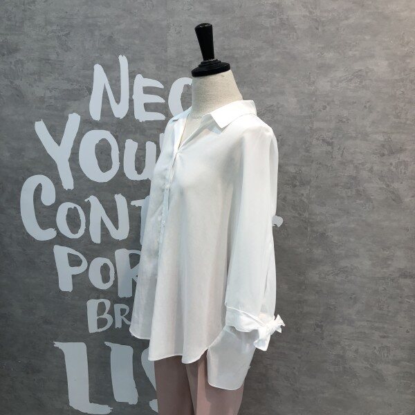 심플하고 베이직한 느낌의 깔끔한 블라우스 셔츠로 어깨선부터 자연스럽게 떨어지는 루즈핏이 멋스러우며 소매리본과 트임이 포인트되어 고급스러운 디자인의 아이템입니다