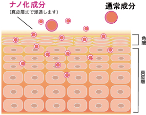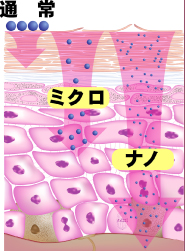 1nm(ナノメートル)とは10億分の 1m=100万分の1mm=1000分の1ミクロンまで成分を分子化し配合しています。例えると、地球をピンポ ン玉にするくらい物質を小さくする技術のこと。 |