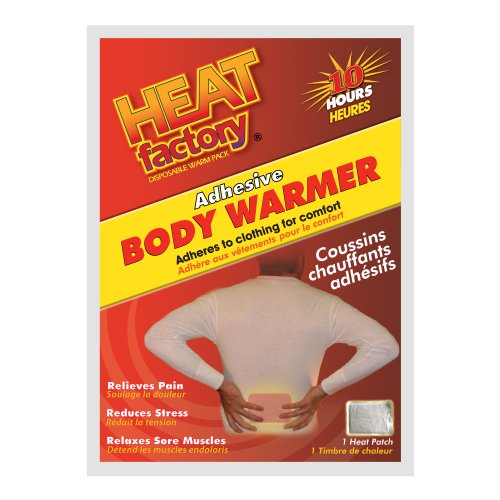 -. Binding : Sports -. Brand : Heat Factory -. EAN : 0037137231106 -. Feature : Pack of 40 individually sealed air-activated adhesive Body Warmers provide long-lasting warmth when applied to clothing / Body warmer patch up to 10 hours of continuous warm heat / Ideal for soothing sore muscles, arthritis, stiffness, and for stress relief / Adhesive warmers are designed to be applied to clothing directly over areas needing heated warmth (do not apply directly to skin) -. IsAutographed : 0 -. IsMemorabilia : 0 -. Label : Heat Factory USA -. Manufacturer : Heat Factory USA -. Model : 3110 -. ProductGroup : Sports -. ProductTypeName : OUTDOOR_RECREATION_PRODUCT -. Publisher : Heat Factory USA -. Size : 40-Pack -. Studio : Heat Factory USA -. Title : Heat Factory 10 Hour Adhesive Body Warmer, 40-Pack -. UPC : 037137231106