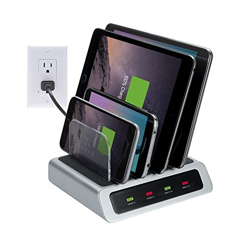 -. Feature : Convenient battery indicator screen displays charging status of devices / Easily charges up to 4 devices at the same time (4 USB ports) / Features two 2.1-amp USB ports for tablets, plus a 1-amp USB port and 1.4-amp USB port for smartphones / Sleek acrylic divider slots organize devices as they charge / Comes with 400 joules of surge protection