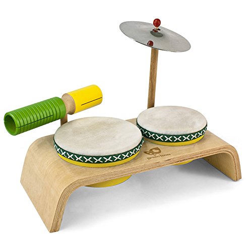 Four percussion instruments on a ergonomically designed curved base are perfect for the budding percussionist. Two removable drums, a bright cymbal, and a non-pitched multi-timbre wood block provide lots of rhythmic options. Includes a pair of wooden sticks/mallets. Curved base is made from sustainable Mangowood. Drums can be removed and played separately.