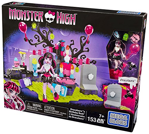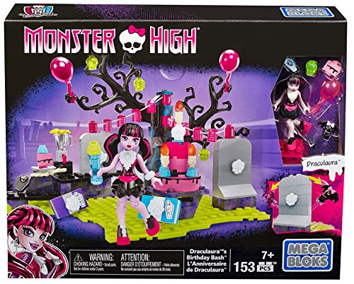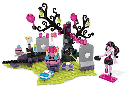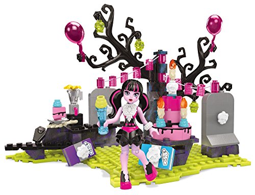 -. Feature : Buildable birthday party with a tree, table, birthday presents, and birthday cake that spins / One highly detailed, super-poseable Draculaura mini fashion figure with iCoffin and a unique look / Buildable tombstones with hidden Count Fabulous / Accessories include birthday balloons and streamers, blender, and drink / Combine with other Mega Bloks Monster High playsets to build your own freaky fabulous world!