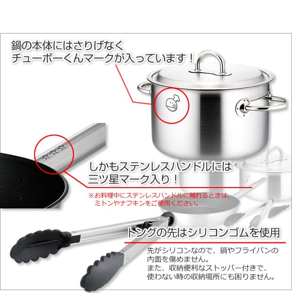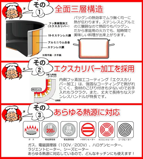 | 素材・材質 | 本体:アルミクラッド材(全面三層構造 18-8ステンレス鋼・アルミニウム・ステンレス鋼)、 表面加工(内側):フッ素樹脂加工 フタ・ハンドル:18-8ステンレス鋼 |