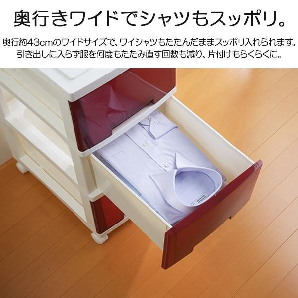 | ちょっとしたインテリアにもなる、おしゃれなチェスト!!奥行が広めなので、たたんだYシャツもすっぽり収納いただけます。工具不要で組み立てができます。キャスター付きだからお掃除する時も便利です♪ |