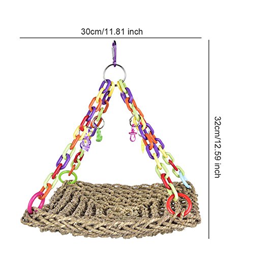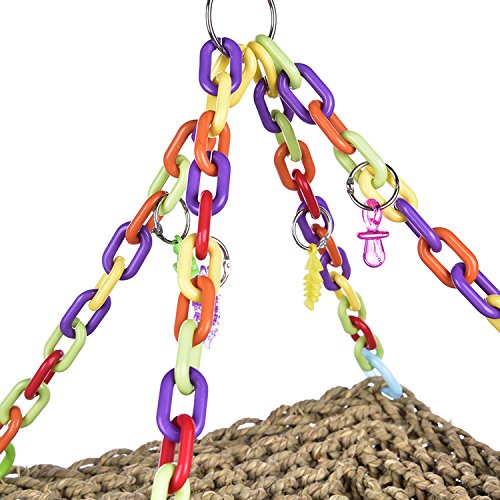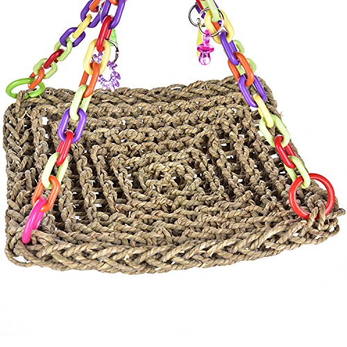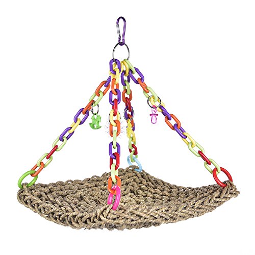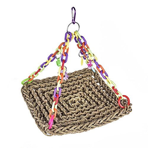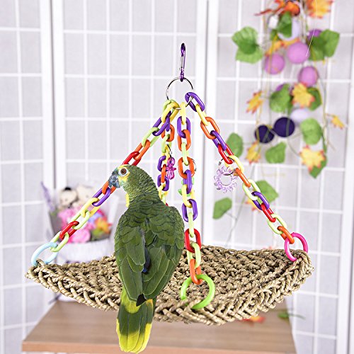Features: Straw plaited swing toy for parrot to climb, gorgeous color, can be hung for decoration of bird cage, also can be bitten or climbed, to strengthen their balance and coordination skills. Role: to ease the pressure and boredom, suitable for the pet to climb and bite, is conducive to the physical health of birds. Parameter: Material: Grass / plastic Size(approx.): 30 x 30cm / 11.81 x 11.81 inch, with total height about 32cm/12.60 inch Note: There may be 1-3cm error due to manual measurement, the color of the accessories will be sent randomly. Packing List: 1 x Parrot swing 0