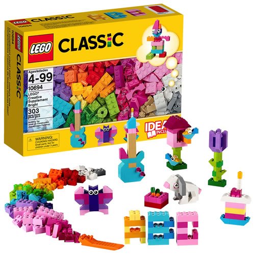 4 years & up. Follow your imagination with this pile of brightly colored classic LEGO(R) bricks! From butterflies and flowers to guitars and cakes, this set comes with bricks in 20 different bright colors to help you create whatever you imagine. With 4 pairs of eyes for creating all kinds of creatures, this set also comes with ideas to help you get started. Designed for builders of all ages, A great addition to any existing LEGO(R) collection. All models pictured can be built from this set simultaneously. Includes a brick separator. 303 pieces.Feature