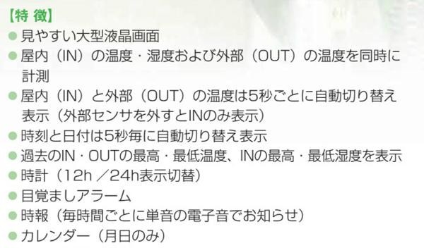 | 仕様 | ・電源:単4形電池×1 ・センサーコード:約1.9m 【使用範囲】 ・温度/IN(本体センサー):-10~50度、OUT(外部センサー):-50~70度 ・湿度:20~90%RH 【精度】 ・温度:±1度(0~50度)、左記以外±2度 ・湿度:±5%RH(45~70%)常温、左記以外±8%RH |