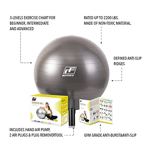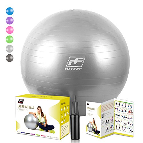 2000lbs Exercise Stability Ball By RitFit, Anti Burst for Pilates Yoga Gym Fitness ,Use As Desk Chair, Hand Pump& Workout Guide Included,Gym Quality (Silver, 65cm)