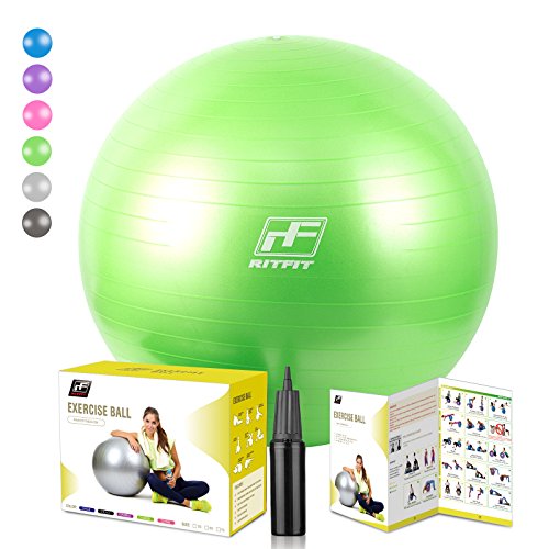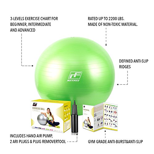2000lbs Exercise Stability Ball By RitFit, Anti Burst for Pilates Yoga Gym Fitness ,Use As Desk Chair, Hand Pump& Workout Guide Included,Gym Quality (Green, 75cm)