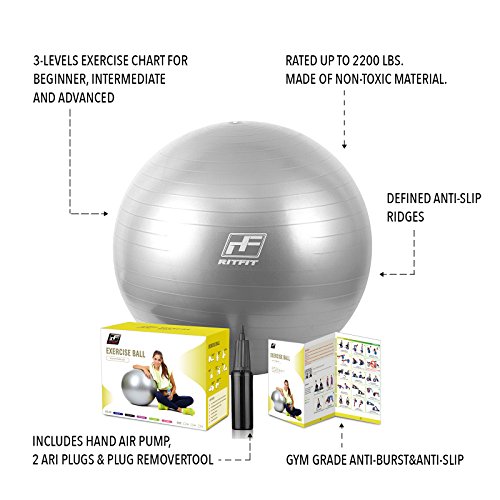 2000lbs Exercise Stability Ball By RitFit, Anti Burst for Pilates Yoga Gym Fitness ,Use As Desk Chair, Hand Pump& Workout Guide Included,Gym Quality (Silver, 75cm)