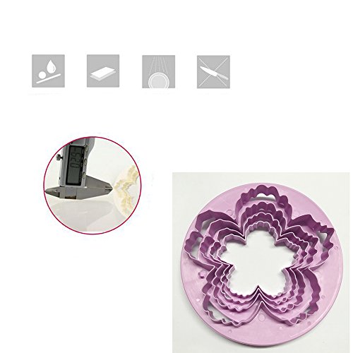Product Description Gum Paste Flowers Cake Decorating Kit peony cutter set With this set, you'll open a new world of decorating possibilities for your cakes! Cut petals used to make exquisite gum paste flowers like those shown here with the peony petal cutters.Cutters are comfortable to hold, with a contoured top and precise cutting edges. This peony cutter set make it easier to make amazing, life-like flowers and unique blooms even if you've never made gum paste flowers before! TIPS:The peony cutter color may come random How to Use 1 Preparation:flowerpaster,edible glue ,a rolling pin,Peony Petal Cutters,a foam pad,a ball tool,a muffin case and luster dust. 2. Roll out flowerpaste on a workboard to approximately 1-2mm thick. 3. Cut the largest peony shape first.Using a foam pad ,shape the edges of the peony with a ball roll. 4. Place the peony in a large muffin cup or rounded petal mold,so that the peony can dry in a natural open shape .3-5 petals for each sized cutter might be needed. 5. Repeat these steps for the next 3 sizes. Pinch the smallest size petals and then close them up to make a peony bud. This will form the center of your peony. 6. Place the peony petals layer by layer with edible glue. 7. Dust your peony with luster dust to give it great shape and life. 8. More petals can be added to make a larger and more vivid peony. 9. Dishwasher safe.