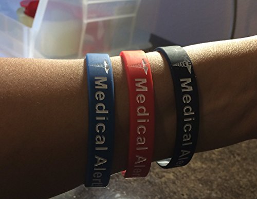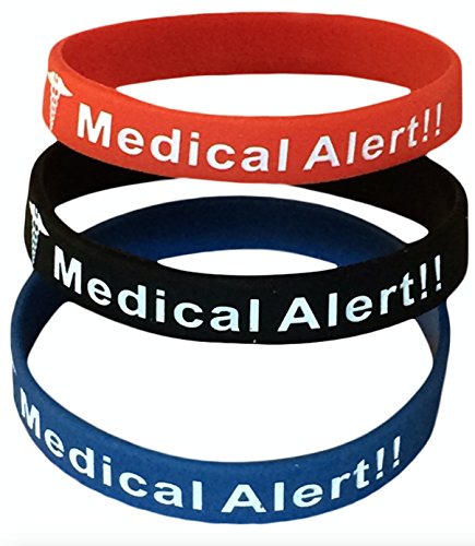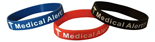 - Feature : 8 inches, 1/2 inch wide. Debossed with lettering filled in-Ideal for most adults or teens(May be too big for those with small wrists) / Medical alert notification in case of emergency and person is unable to communicate properly. / Light-weight. Great for travel. Free Bonus Wellness Article Included! / Set of 3 silicone bands. Metal/Latex allergy friendly. Comfortable. Easy on and off without help. Won't discolor your skin or tarnish. / Easy to read. Assorted Colors. Perfect for sports or working outside.