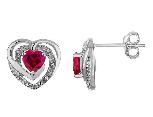 These glittering, swirling 3/5 carat (ctw) red created ruby earrings are further enhanced by 8 sparkling white diamonds and are crafted from sleek polished white sterling silver. Each earring boasts a single heart shaped created ruby adorned by four round, brilliant cut white diamonds.