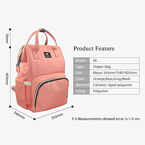 Studio : VK Publisher : VK Binding : Baby Product Product Description ●High Quality Material The diaper bag is made of environmental durable water resistant fabric ,easy to wipe clean.Don't afraid the milk or water spill on the bag when feeding the baby. ●Color Option Black,Orange Pink,Blue,Skyblue,Grey ●Insulated Pockets There are 3 bottle holders in the front of the bag separated from other baby items. These 3 holders with insulation layer of tin foil can keep warm or cold for hours. ●Wide-open Design There's an opening in the back of the bag with a waterproof pocket. It's convenient for you to put in or take out things. ● Wet and Dry Separation Design Wet cloth or diapers can be put in the waterproof pocket separated from dry cloths and diapers. ●Side Tissue Pocket Side tissue pocket design provides quick access to wipes when spills happen or to keep baby clean and fresh. ●Multiple Compartments and Spacious Interior Large interior pocket includes individualized storage compartments and zip close pockets to safely organize baby's toys, burp cloths, apparel and more. Zippered interior and exterior pockets are also handy for safe keeping parent's keys, cell phones and wallets. ●Multi Carry Ways You can use this bag as backpack and handbag. It's comfort to carry all day with board backpack straps. Rivet reinforcement hand straps and you don't need to worry about the bag falling apart.