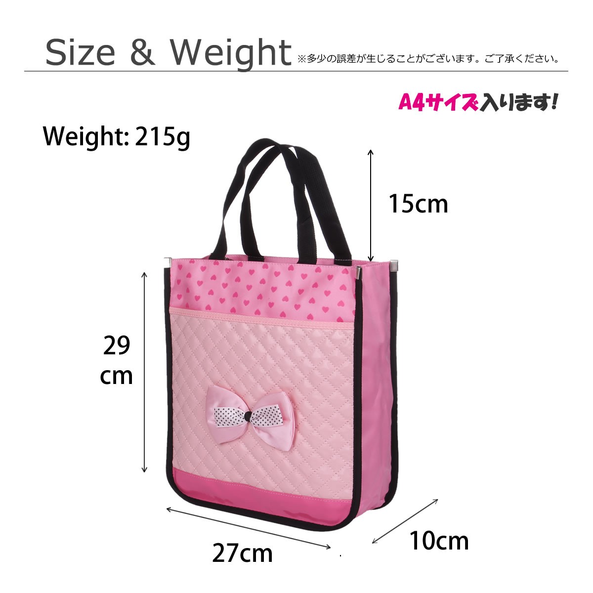 リボン付きガーリーレッスンバッグ塾や習い事だけでなく普段使いにも活躍できちゃうとっても可愛いバッグです◇ファスナー仕様なので中身の飛び出しなど心配無用◆A4サイズが入るので便利◇10cmのマチ付きなのでたっぷり入る◆前面にポケットが付いているので小物などの収納可能◇軽量なのでお子さんでも楽々持てます【サイズ】(約)縦10cm×横27cm×高さ29cm【重量】(約)215g【素材】ナイロン、ポリエステル【生産地】中国【注意】※ゆうメールでの発送となります。※配達日、配達時間の指定はお受けできません。※追跡番号はついておりません。あらかじめご了承下さい。
