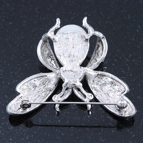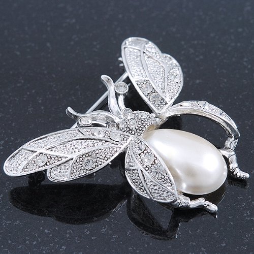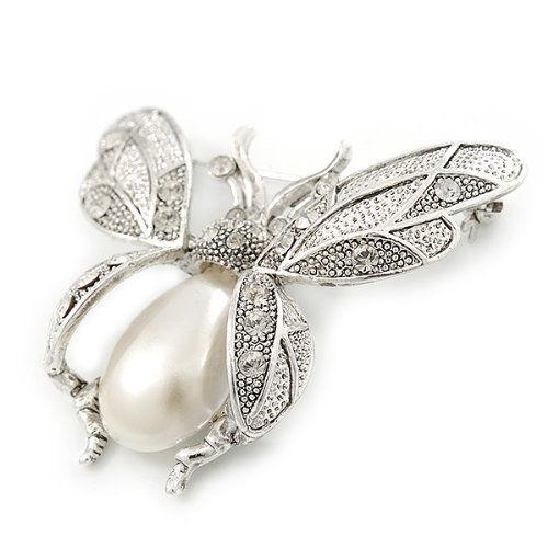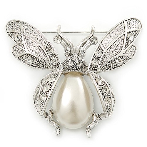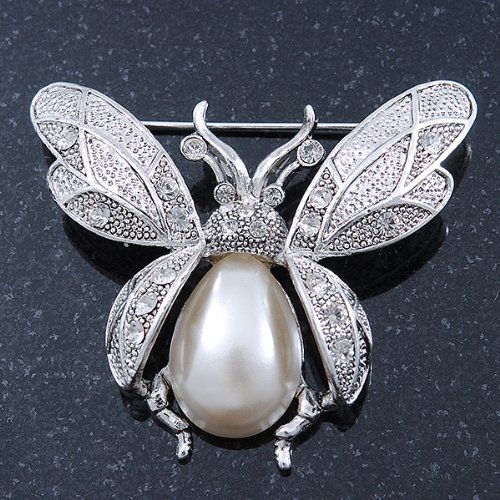 Critter craze! This jeweled interpretation of your favourite flying creature will set your heart aflutter. Featuring an oversized bumble bee design, crafted in silver plated metal. The body made of an oval shape white pearl, the wings decorated with textured detailing and accented with clear Swarovski crystals for a dash of sparkle. The brooch measures about 60mm x 50mm. Secures with a flag pin and revolver clasp. Pinned to your lapel, a feminine scarf or even your handbag, the whimsical design is sure to sparkle day or night. This product does not contain any natural pearls.Feature