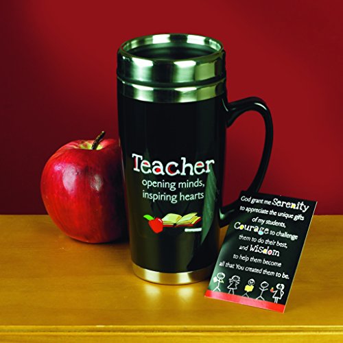 Abbey Press 16 oz. Teacher Travel Mug. Insulated plastic mug features brushed silver metal trim and interior; with slide open/close travel lid and foam bottom. Includes a gift card.16 oz. 7". Teacher: Opening minds, inspiring hearts Gift card message: God grant me Serenity to appreciate the unique gifts of my students, Courage to challenge them to do their best and Wisdom to help them become all that You created them to be.Feature
