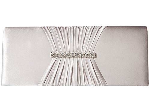 -. Feature : Satin clutch with pleated detailing and rhinestone brooch on flap / Magnetic snap closure / Interior features back wall cc slip pocket / Drop in braided cord strap