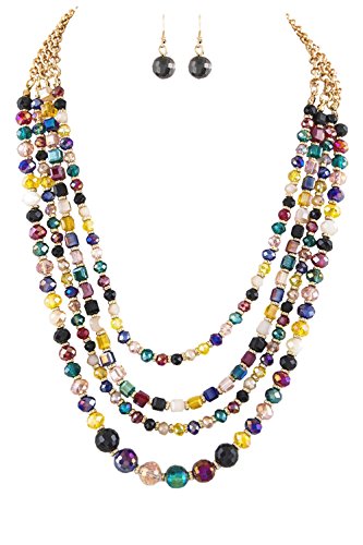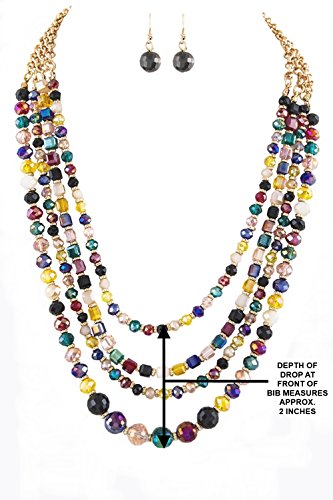 Multistrand, multicolor iridescent aurora borealis round and cube glass bead layered bib statement necklace in shades of pink, purple, blue, yellow, red, black and peach along with small gold-tone spacer beadsThe necklace consists of four lines of beads suspended from gold-tone chains and measures 18 inches in length with an additional 3 inches of wearable length available via extender chain.