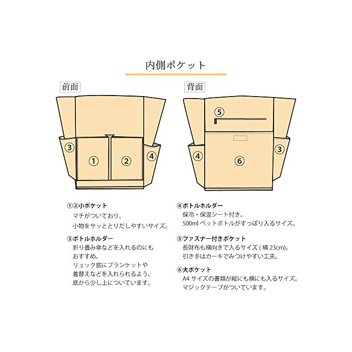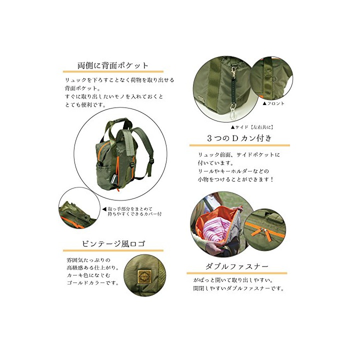 사이즈:H32~41cm W28~55cm D16cm 소재:본체/폴리에스텔100% 중량:598g 세탁가(넷으로 넣고 세탁해 주십시오)생산국:중국제색:카키×오렌지