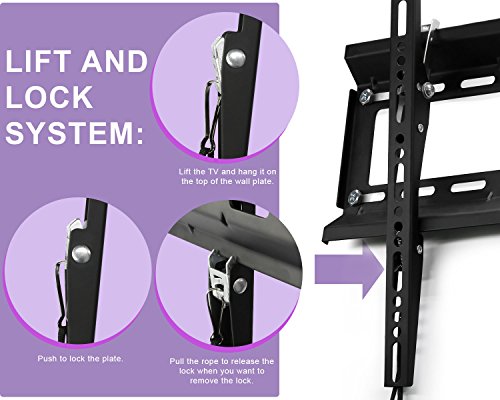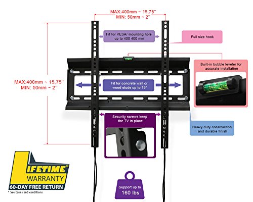 -. Feature : LIFETIME GUARANTEE! For Special Promotion check ASIN B0192R5SD0 / Fit most TVs for 17-47" LED, LCD, Plasma TVs and flat panel display. Compliant to VESA 50x50, 75x75, 100x100, 200x200, 200X150mm, 200x100, 300x300, 300x200, 400x400, 400x300, 400x200 (mm) / 1.5" low profile; Adjustable for better view: Can tilt up to 10 degrees for optimal viewing. / Max load capacity: up to 120lbs. Durable black powder finish, Heavy duty one-solid-wall-mount steel construction for permanent safety. Full size TV hook. Convenient quick-release lock system. Please install this TV mount on firm and strong wall. / Easy installation: Installation manual and handware included. Built-in bubble leveler for perfect balance after installed. Please check VESA (mounting hole pattern), stud spacing, possible blocked cable/input and TV weight P.R.Ior to making purchase decision to determine whether this TV wall mount fits your TV and the installation application.