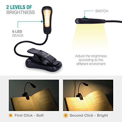 - [UPGRADED ] 3000K WARM SMD LED TECHNOLOGY. Most suitable light color for eye-care reading. 6 LEDs evenly light up 3x times lighting area than normal LED. 3 BRIGHTNESS LEVELS. THE BEST portable book light for bookworms & kids.