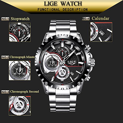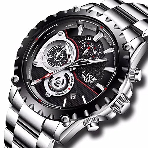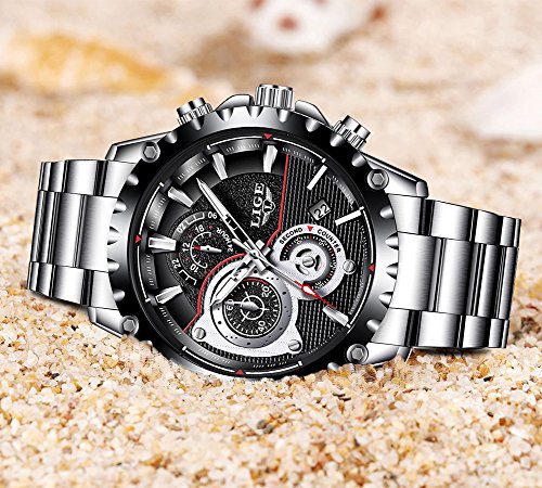 Stainless steel strap and big case comfortable to wear 3ATM Water Resistance, Splash/rain resistant, Hand Wash, Rain Day, Sweating, NO Problem. Date window(3 dates), mutifunction (1/10 second, 60-second and 60-munite sub-dials)