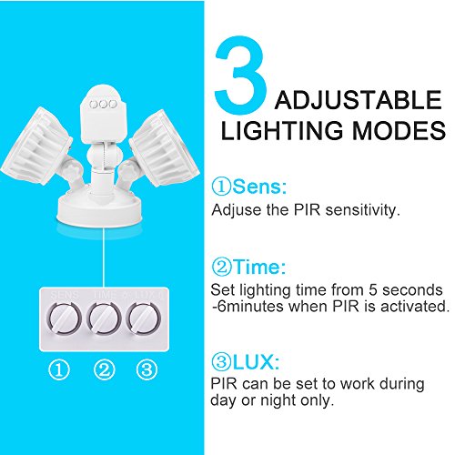 - ▶ADJUSTABLE DESIGN: LED Security Light Easy rotatable light head, lens hoods and motion sensor, adjustable detection range and lighting time, DIY the light time as your need to fulfill different requirements