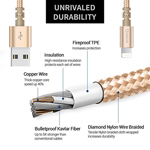 USB type: USB 2.0 standard cable length: 1.83m 6ft cable shape: Round OD 3.5mm color: Gold cable for charging: 53*0.08TS 250D each red and black inside cable for data sync:16*0.08TS 250D each connector material: USB and Lightning also- Aluminium alloy and PVC connector for lightning plug: Plate with nickel and gold planted fully compatible IOS 11