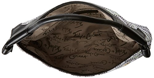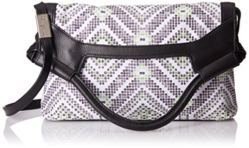 Canvas clutch featuring printed lining and leather trim, cross-body strap, and top handle