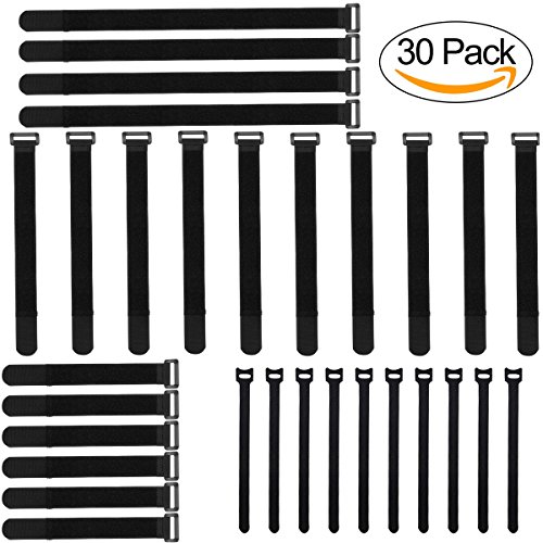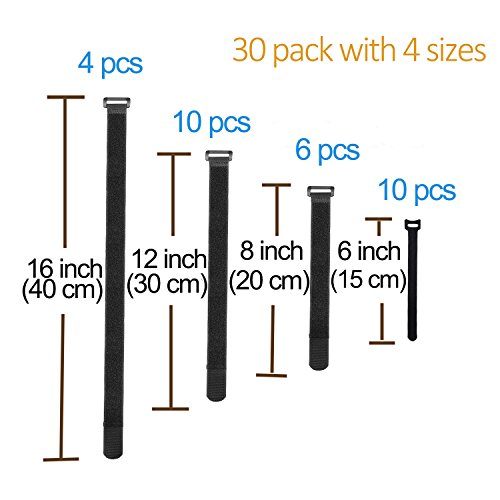 Adywe 30 Pack(6"- 8”-12”-16”) Black Adjustable Cable Wire Ties with Plastic Buckle, Reusable Fastening organizer Cord Ties, Self-adhesive Hook and Loop for Cord Management