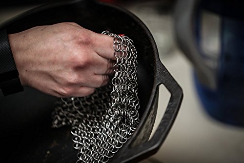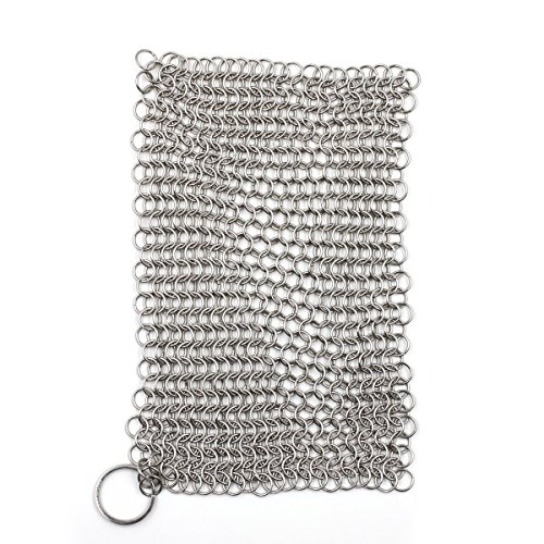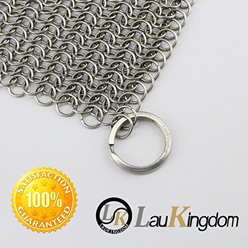 LauKingdom Cast Iron Cleaner XL 8x8 Inch Stainless Steel 316 Chainmail Scrubber for Cast Iron Cookware. WORKS LIKE A CHARM ON STAINLESS STEEL COOKWARE ENAMELED CAST IRON, AND MORE.. The 8x8 inch Small Ring Chainmail Scrubber makes fast work of tough cleanup