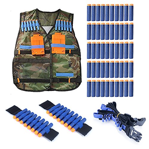 -. Feature : √.Package:Including 1 piece camouflage elite tactical vest and 50 pieces soft foam darts and 2 pieces hand wrist bands and 1 piece bullet strap. / √.Material:100% new and brand.The vest is made of high quality nylon,which is lightweight and durable.The darts are soft and easy t carry,making lots of fun when playing,and the hand wrist bands and bullet strap will create exciting atmosphere during the games. / √.Dimension:The vest is appro 21.3"X18.5" with adjustable waistline,so it could suitable for the children who are over 3 years old. / √.Function:Tactical vest kit lets you carry along lots of extra firepower,at the same time,you can store up to 16 extra darts with the hand wrist bands and more darts on the bullet strap. / √.Perfect Gift for Kids:Great gift for your kids and fulfill their hero dreams.Your children will love it.Please order it soon and not miss so fashion toys.