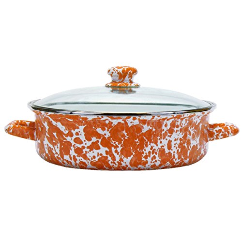 -. Feature : 5 Quart Saute Pan with Lid - 10.25 Diameter - Stands 2.85 Inches Tall / Beautiful Orange Swirl Pattern on Porcelain Enamel Finish / Part of the Golden Rabbit Orange Swirl Collection / Stainless Steel Rims for Extra Durability / Oven and Stovetop Safe - Works with Induction - Dishwasher Safe - Not Intended for Microwave