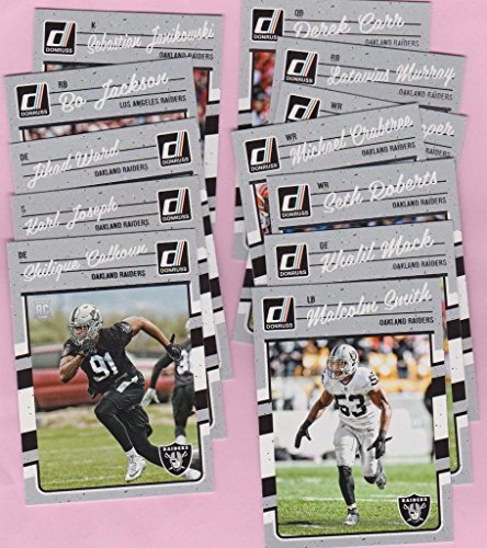 Oakland Raiders 2016 Donruss NFL Football factory sealed 14 card team set including Bo Jackson, Derek Carr, Latavius Murray, Amari Cooper, Michael Crabtree, Sebastian Janikowski, Seth Roberts, Khalil Mack and Malcolm Smith plus rookie cards of Jihad Ward, Karl Joseph, Shilique Calhoun and short printed Rated Rookies Connor Cook #360 and DeAndre Washington #363.