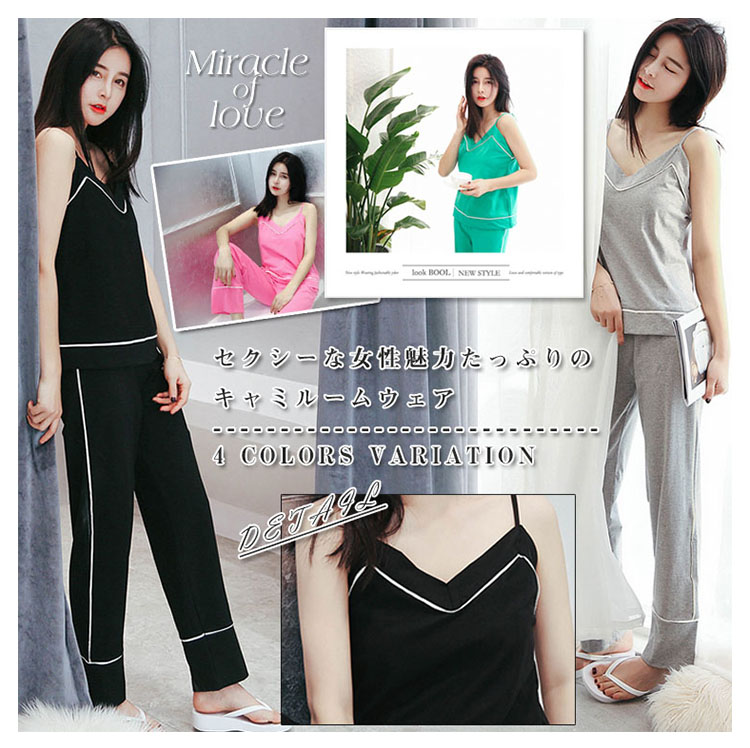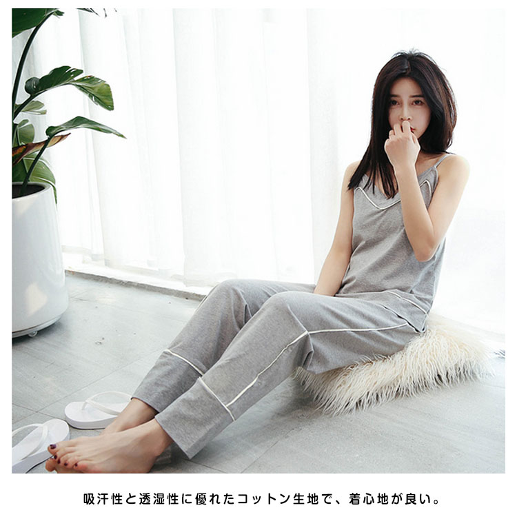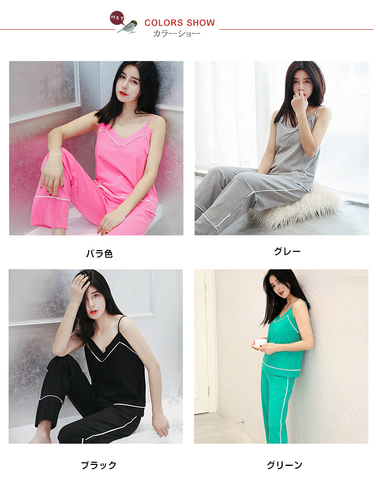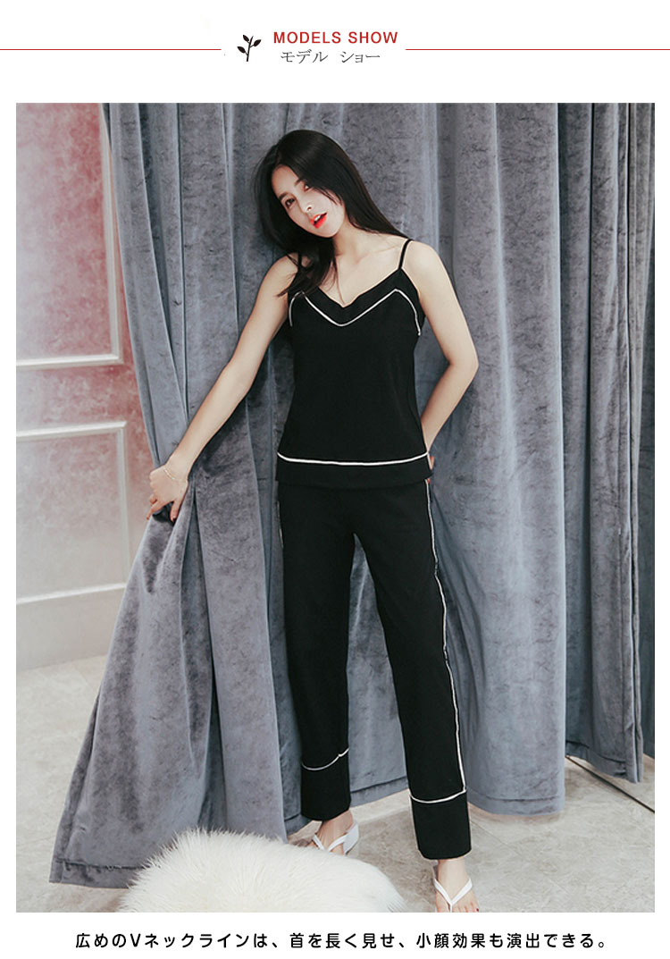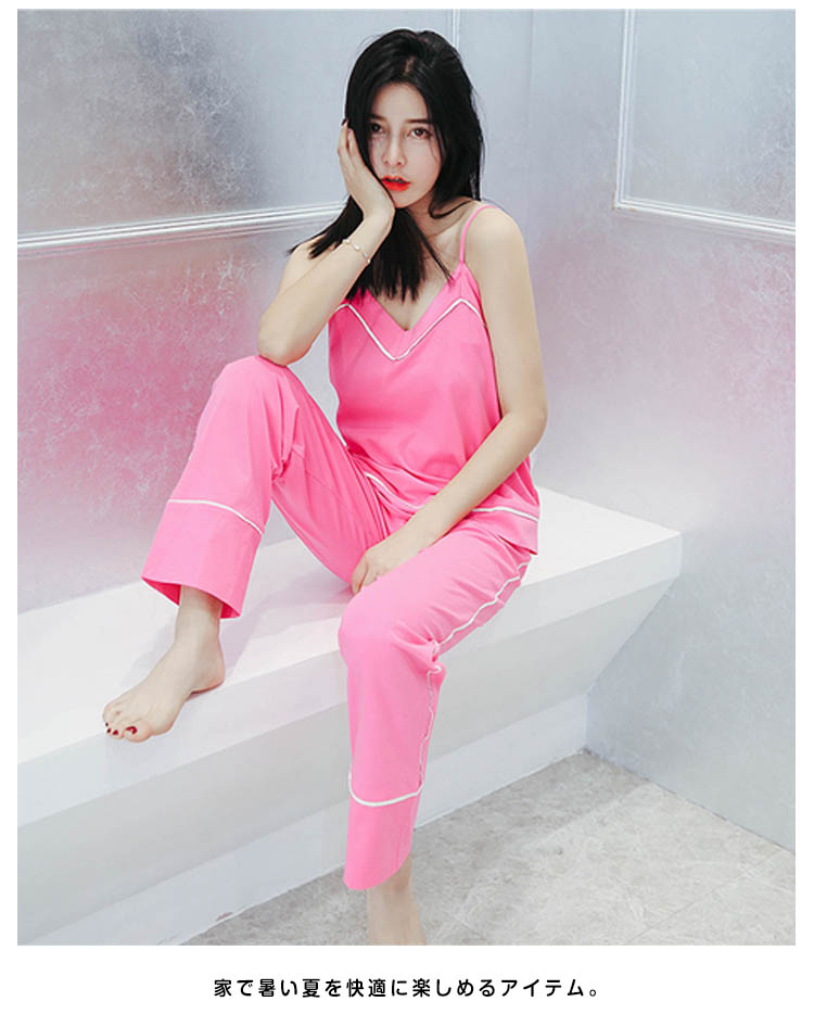 | セクシーな女性魅力たっぷりのキャミルームウェア。広めのVネックラインは、首を長く見せ、小顔効果も演出できる。吸汗性と透湿性に優れたコットン生地で、着心地が良い。トップスもパンツも周囲につけた白いふちで、着やせの効果を際立つ。家で暑い夏を快適に楽しめるアイテム。 | |