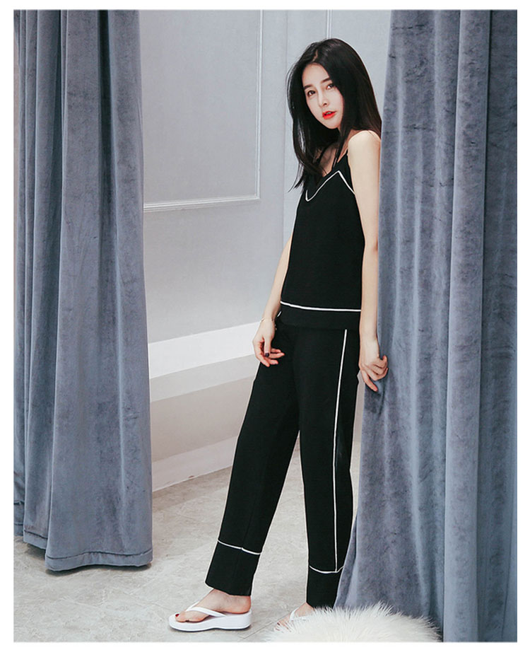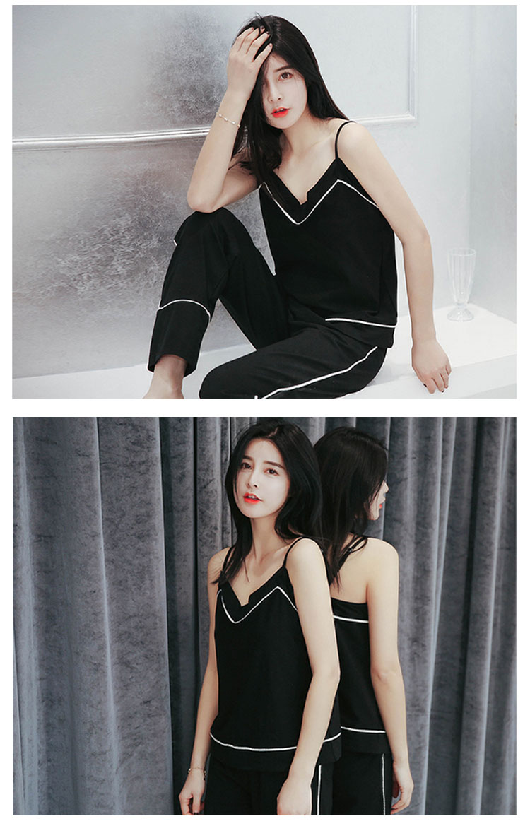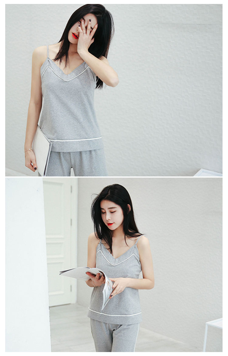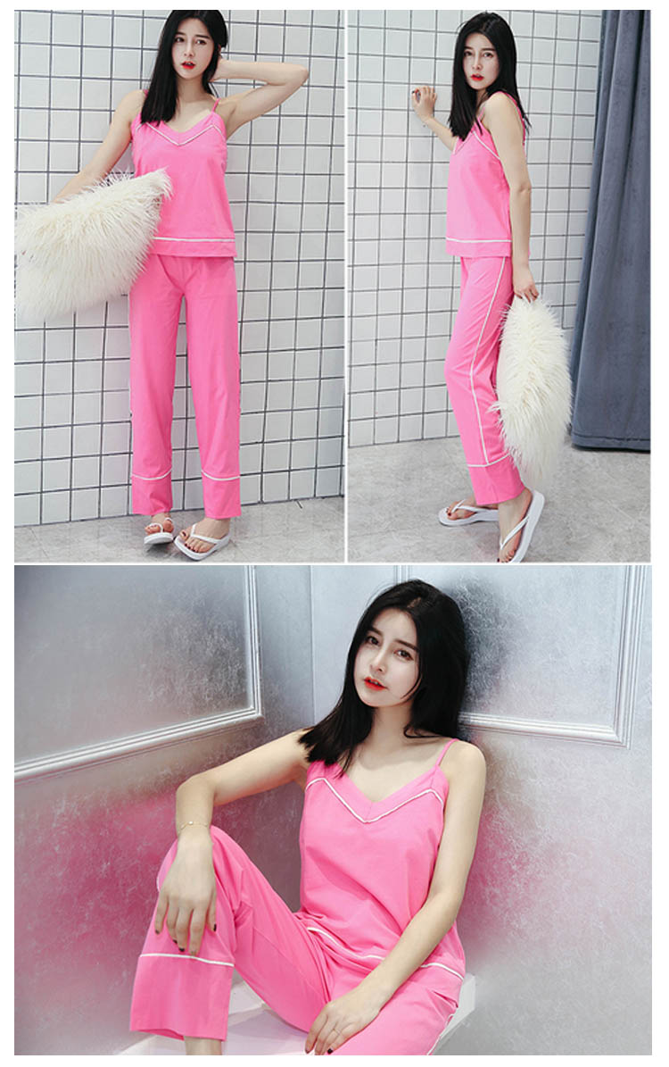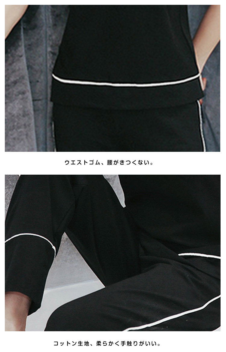 | セクシーな女性魅力たっぷりのキャミルームウェア。広めのVネックラインは、首を長く見せ、小顔効果も演出できる。吸汗性と透湿性に優れたコットン生地で、着心地が良い。トップスもパンツも周囲につけた白いふちで、着やせの効果を際立つ。家で暑い夏を快適に楽しめるアイテム。 | |