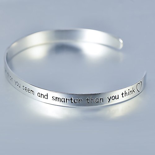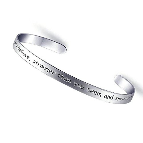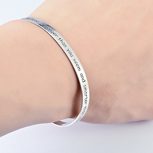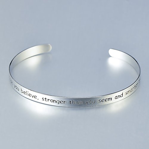-. Feature : 100% Sterling Silver Cuff design bacelet with clearly read Inspirational words / Message read : "You are braver than you believe, stronger than you seem and smarter than you think" / Barcelet Diameter: 2.75inches,Barcelet Width: 0.24inches,weight about 9G / Craft in 925 sterling silver ,come with leather presentation box / Hypoallergenic 925 sterling silver allows for comfortable wear, especially for those with sensitive skin. it makes a prefect gift to any women
