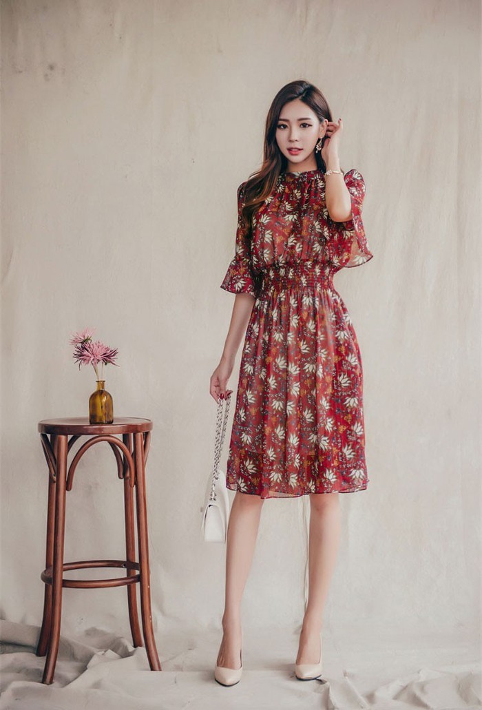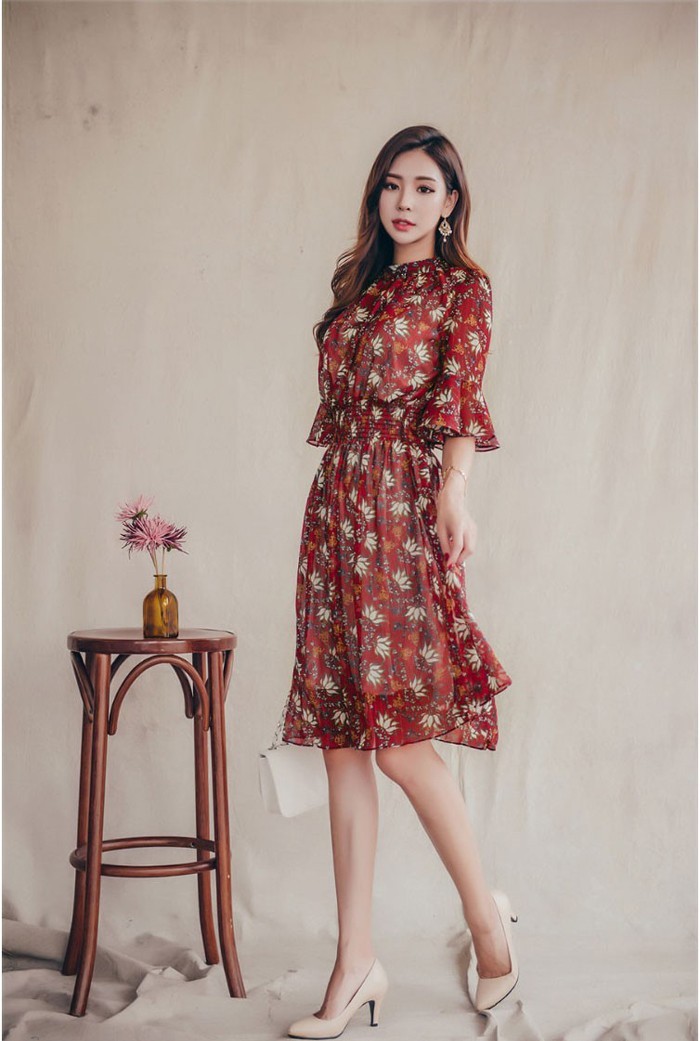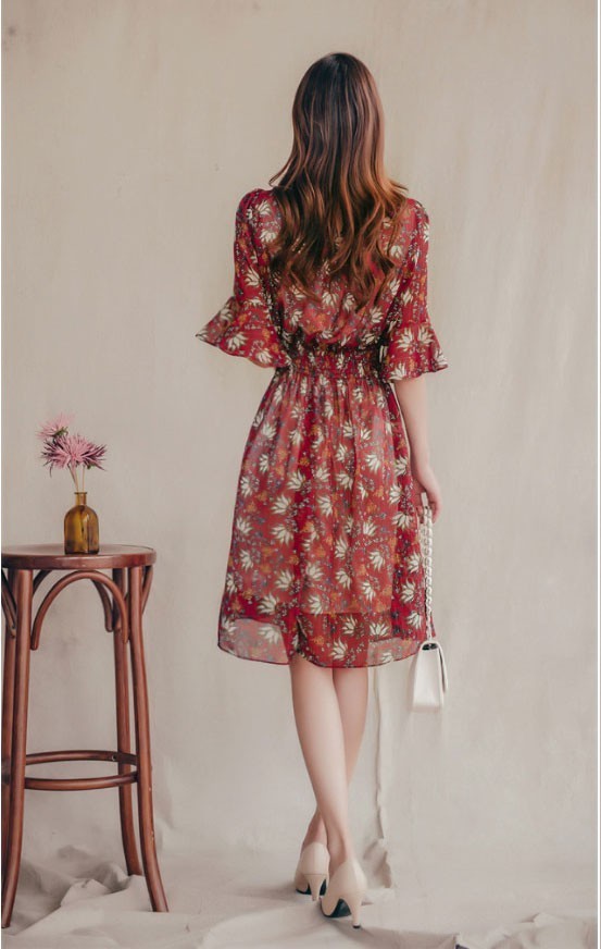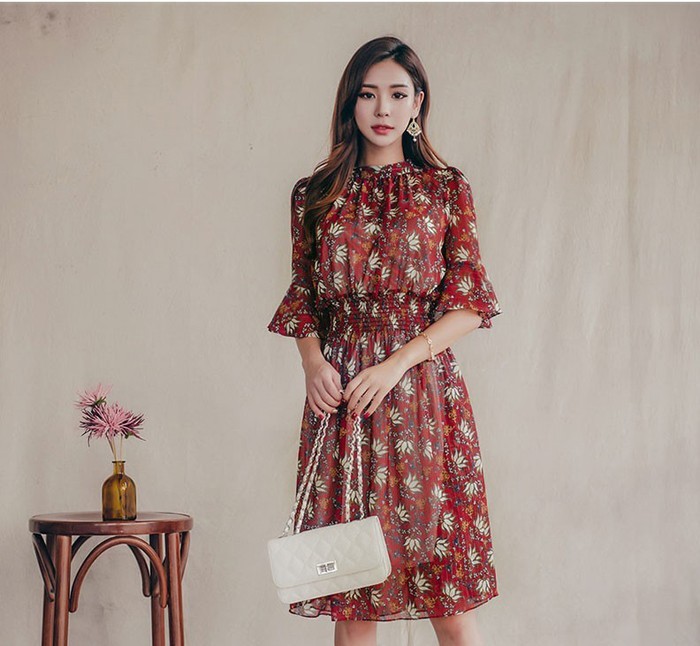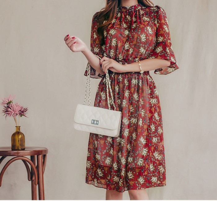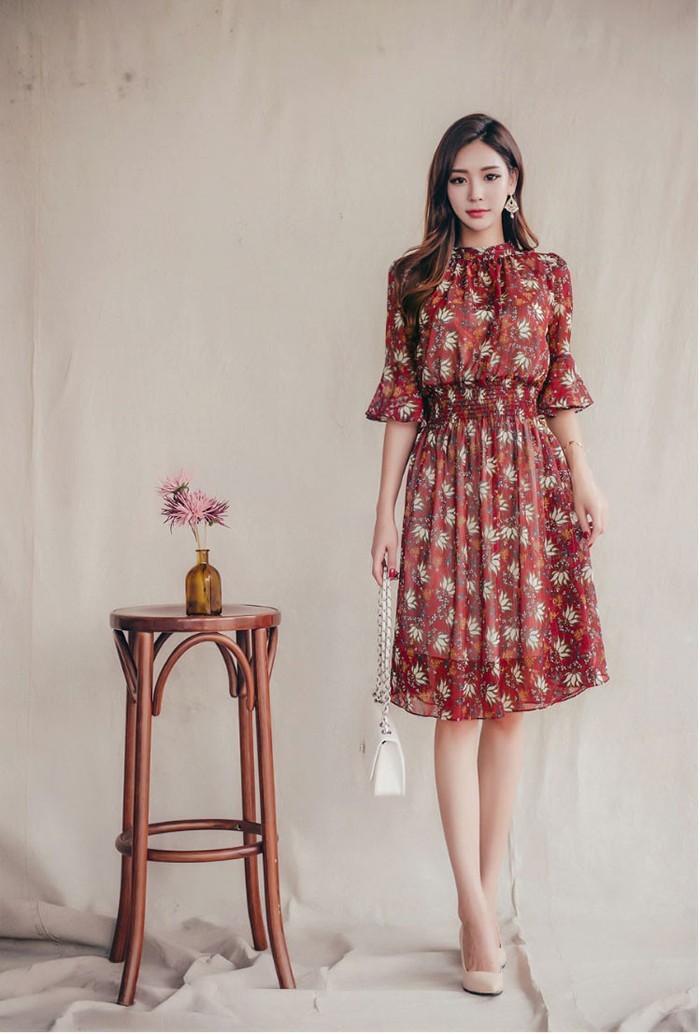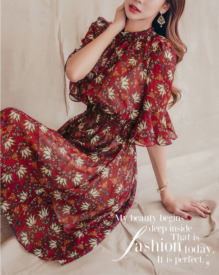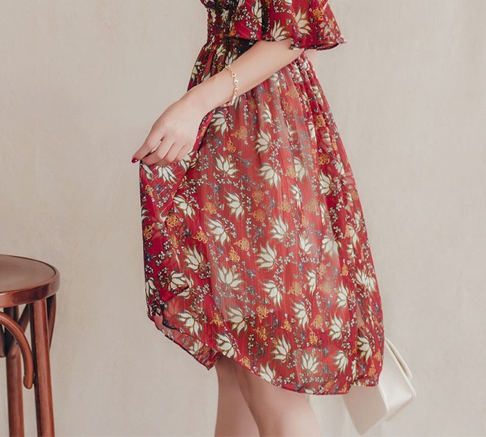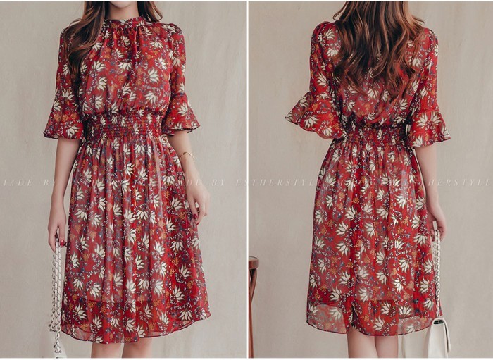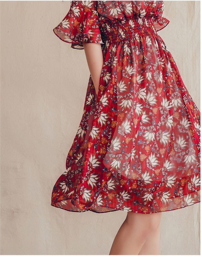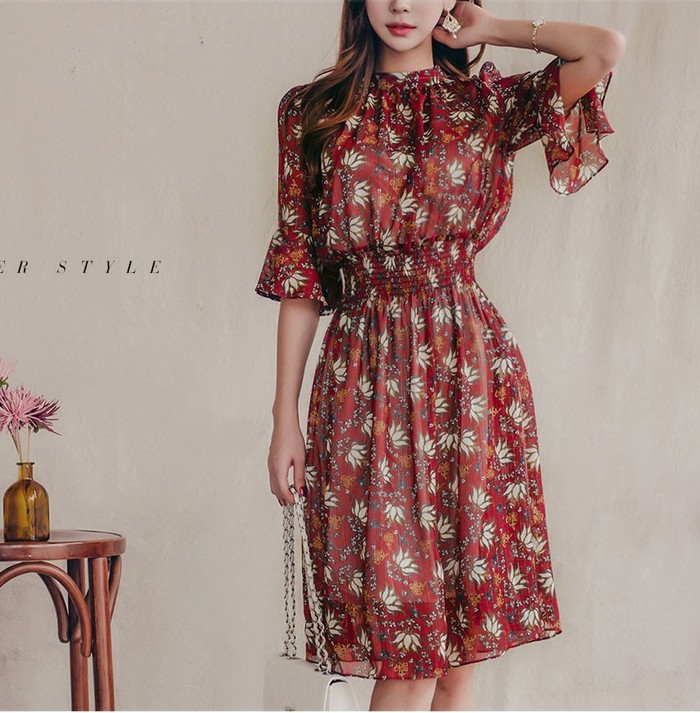 商品名:ワンピース 膝丈 柄 5分袖