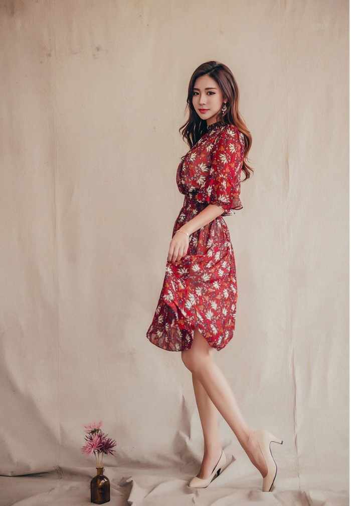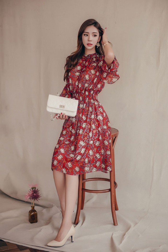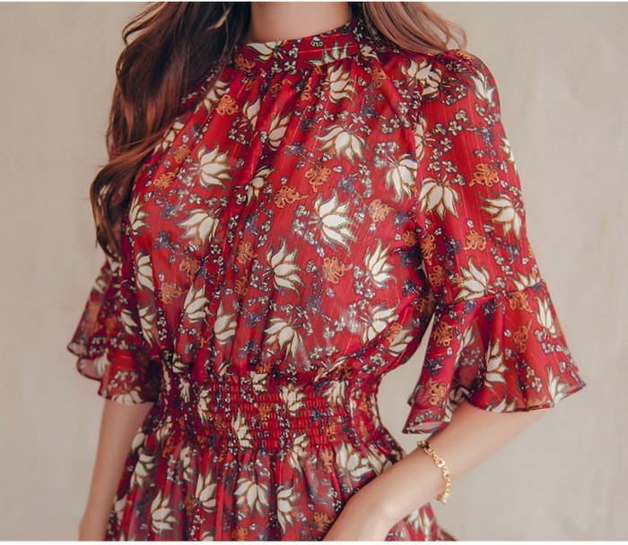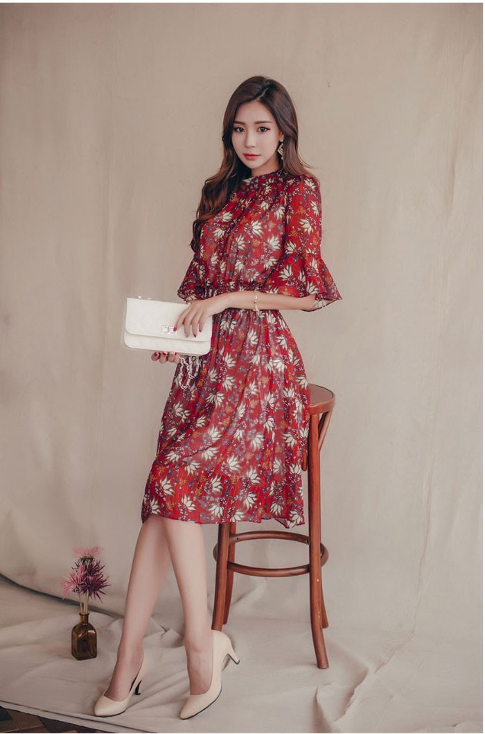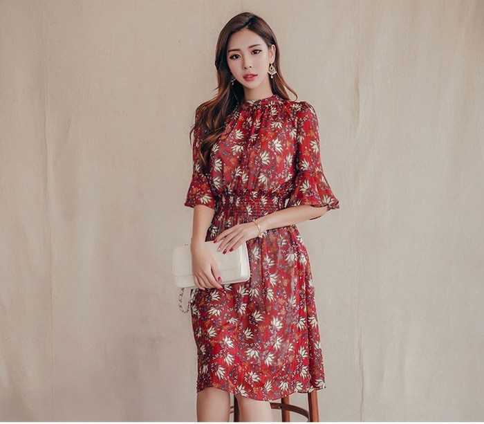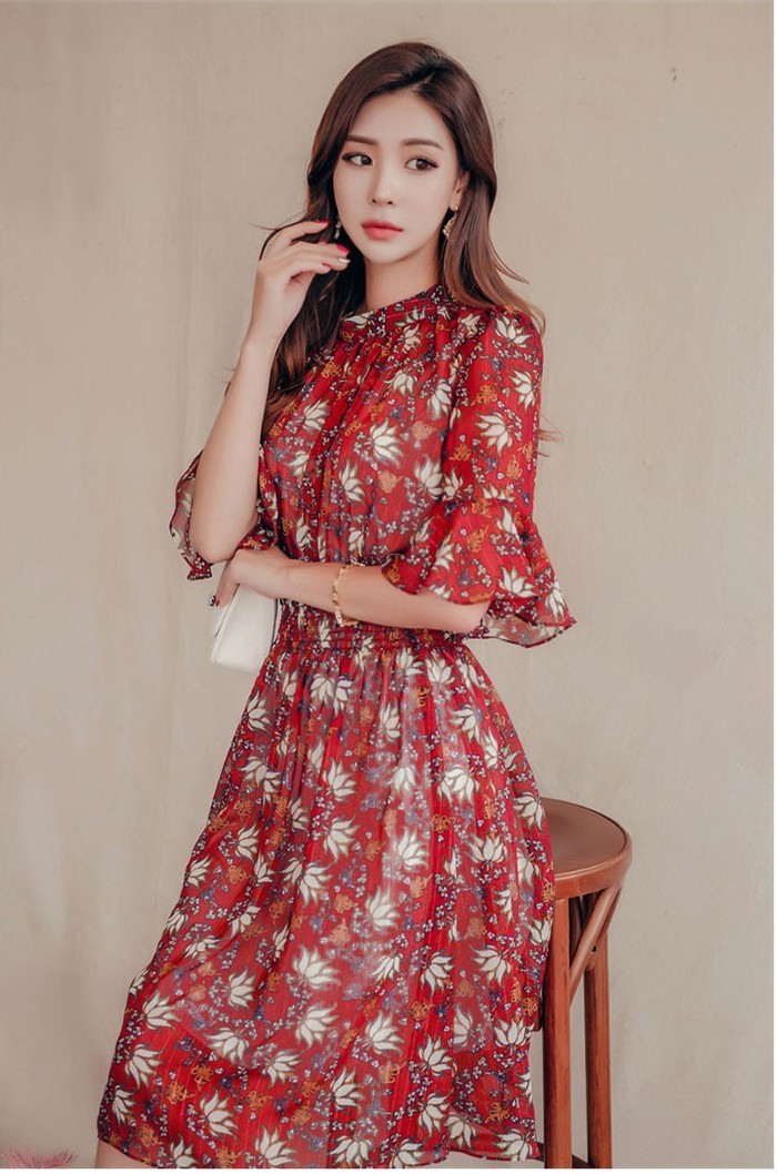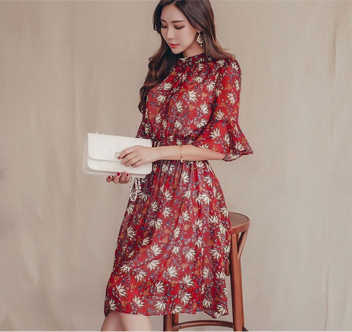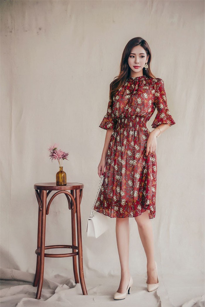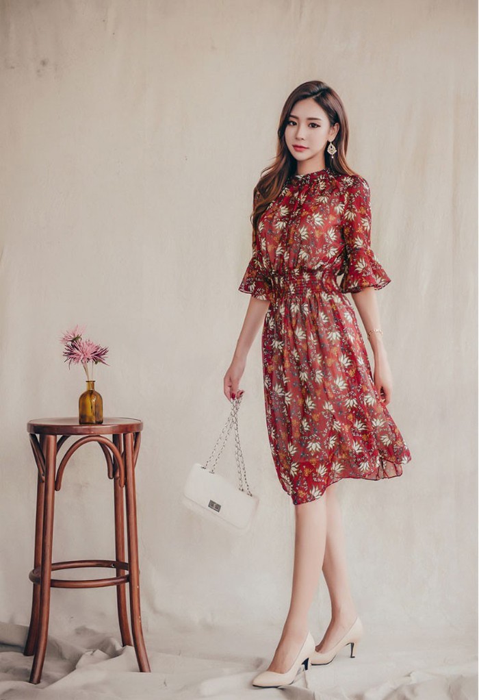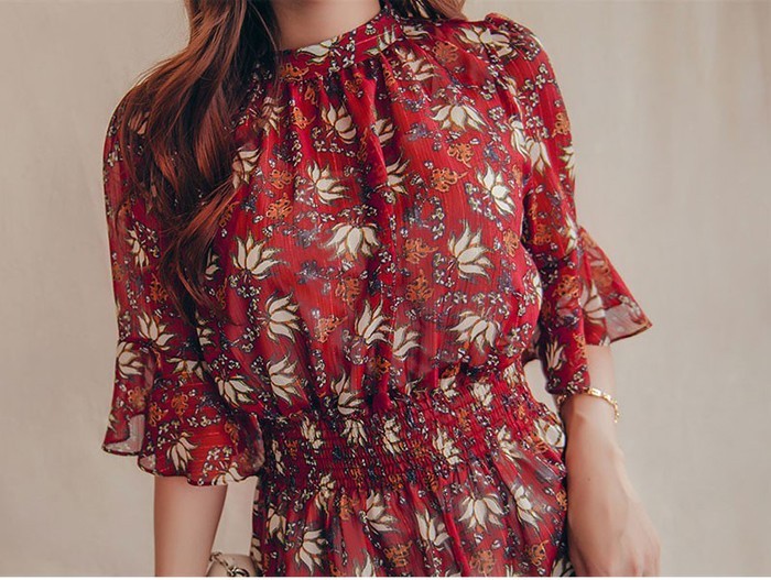 商品名:ワンピース 膝丈 柄 5分袖