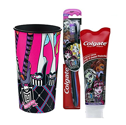 MONSTER HIGH ISPIRED BRIGHT SMILE 3PC ORAL HYGIENE SET! (1) MONSTER HIGH SOFT MANUAL TOOTHBRUSH (1) MONSTER HIGH MILD BUBBLE FRUIT TOOTHPASTE, 4.6 OZ PLUS BONUS MONSTER HIGH MOUTH WASH RINSE CUP! ...