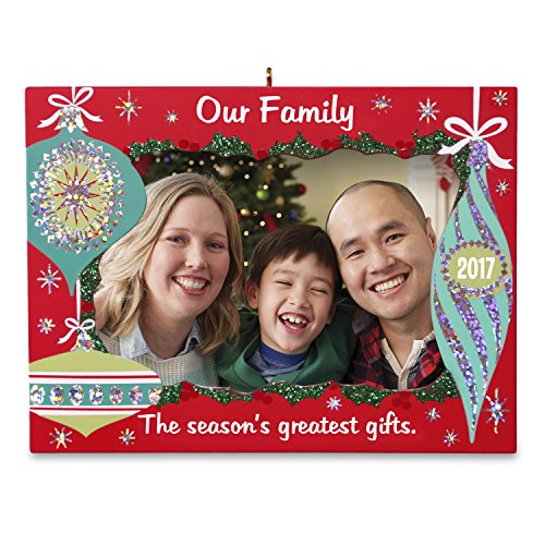 Put a cherished photograph in this photo frame Christmas tree ornament adorned with shiny jewels. Ornament reads, "Our Family: The season's greatest gifts 2017."